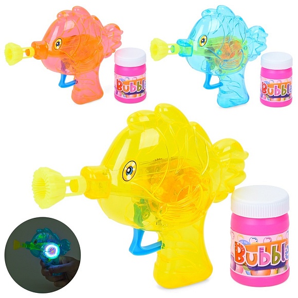 Мильні бульбашки 4837 пістолет-рибка, світло, запаска, 3 кольори, бат.(табл), кул., 17,5-19-4 см.