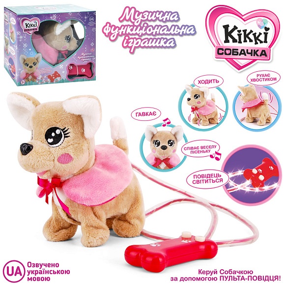 Опис Собака m 5696 i ua Кіккі, дист.кер.(поводок), рух.хвіст,муз.(укр)-пісня,світло,бат.,кор.,23-20-12см.