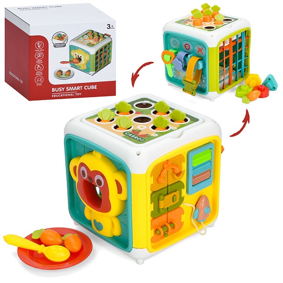 Опис Гра YL562 куб,бізікуб,14,5см,город,гра-нагодуй мавпу,геометрика,засуви,грань-резинки,рух.дет.,в кор.