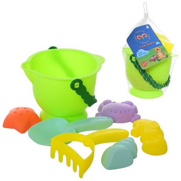 Опис Набір для пісочниці 680 відерце, лопатка, граблі, формочки, сітка, 16-16-16 см.