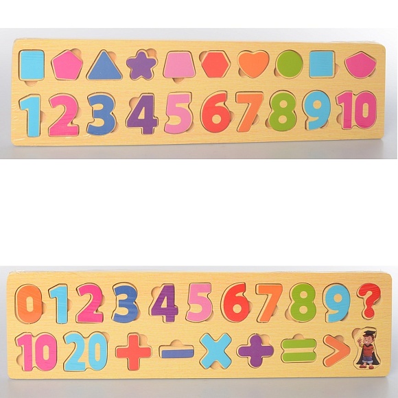 Опис Дерев'яна іграшка Рамка-вкладиш MD 2216 цифри, фігури, знаки, 2 види, кул., 42-11-1 см.