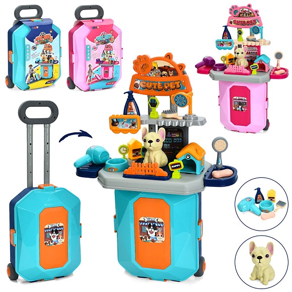 Опис Набір гральний «грумер» d57994-a стіл 46-24-66см,склад. в чемодан(ручка,2 колеса),фен, гребін.,аксес