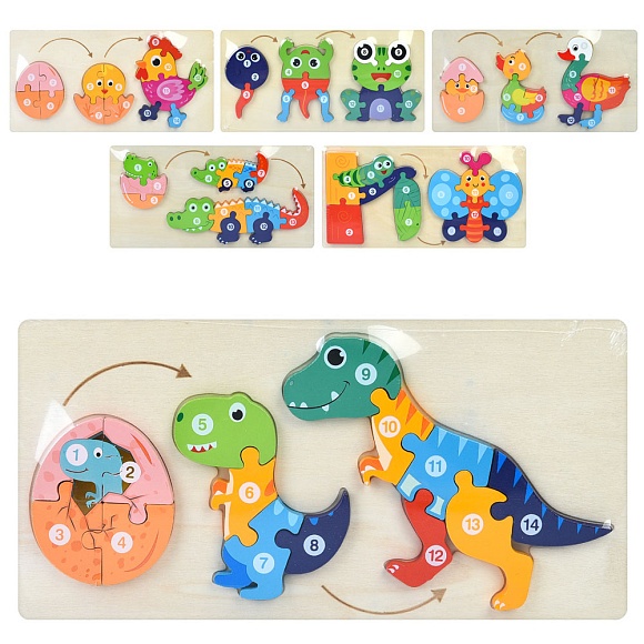 Опис Дерев'яна іграшка Пазли MD 1970 Життєвий цикл, 3в1,6видів(метлик,крокодил,півник,качка,жаба,динозавр