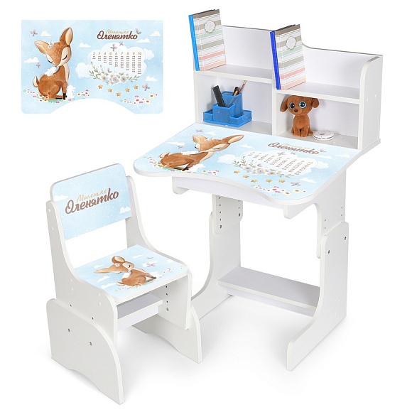 Парта N 2071-16-1 зі стільчиком,69,5х44,5см.,регул.висота 56,5/67,5см.,оленятко,табл.множення,білий.