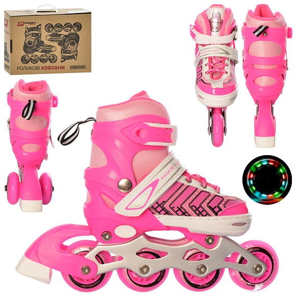 Опис Ролики a 4137-xs-p(27-30) розсув.,шнур.+бакля,ал.рама,кол.ПУ64мм-1світ.,комбо,рожевий,кор.,35-27-10