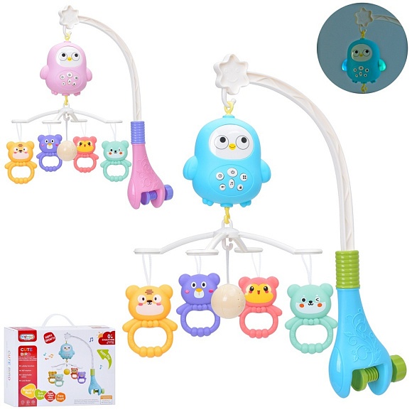 Опис Карусель на візок 368-20 підвіски5шт.(брязк.,4шт.тварини),2кольори,муз.,світло,бат.,кор.,31-24,5-7,5