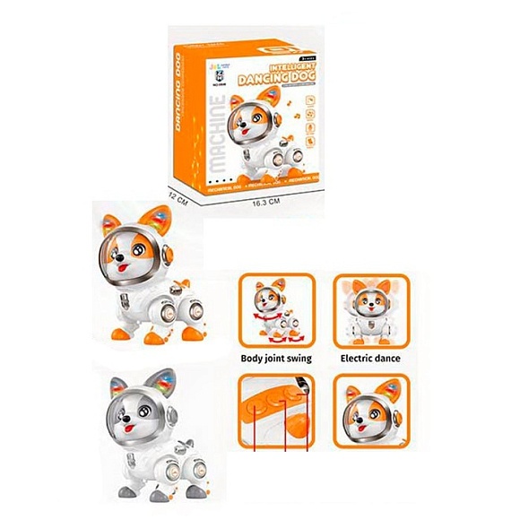 Опис Музична іграшка 0846 собака, ходить/танцює, 2 кольори, муз., світло, бат., кор.,16,5-19,5-12 см.
