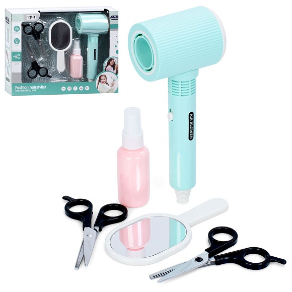 Опис Набір аксесуарів a2009-1 набір перукаря, фен-повітря, дзеркало, ножиці, бат., кор.,32-24,5-7см