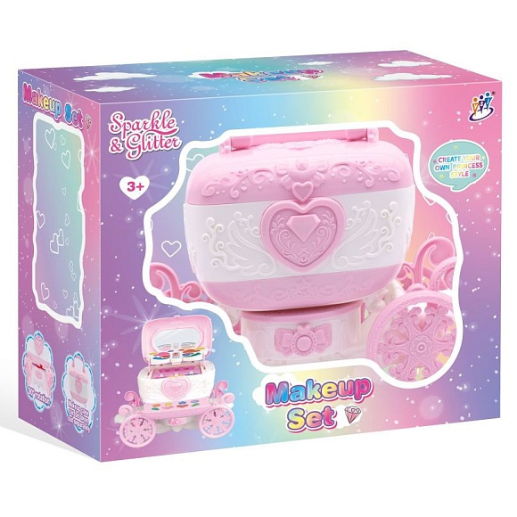Опис Косметика 29011c скринька-карета, муз.,світло,тіні, лак 3шт,помада,дзерк.,на бат,в кор.,28,5-24-13см