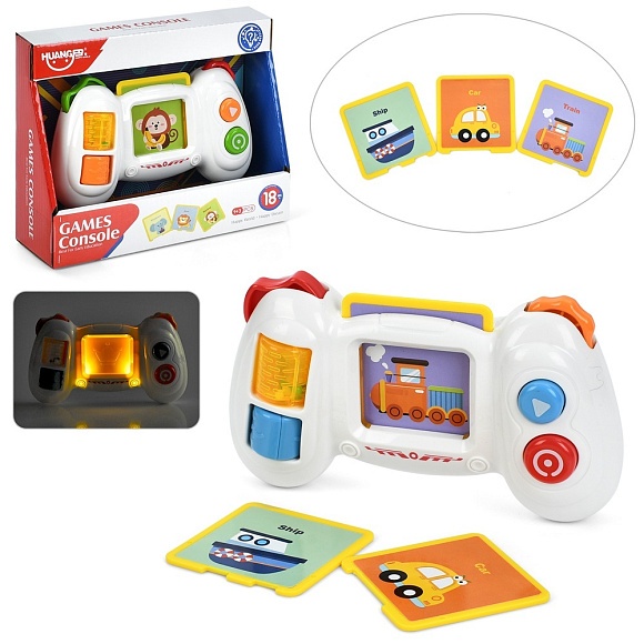 Опис Пульт HE0554 навчальний, картки 3 шт. (тварини,транспорт),брязкальце,мікс кольорів,муз.,світло,бат.