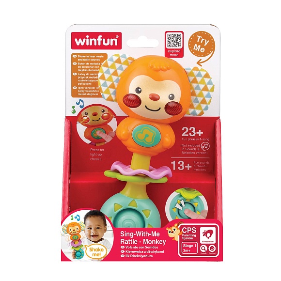 Опис Брязкальце 240105-NL мавпа, шуршить, м'яка кнопка, муз., світло, бат., кор., 14-20-6 см.