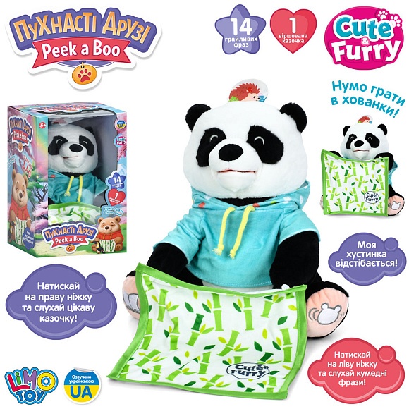 Опис Тварина m 6226 i ua панда, грає в хованки, м'яка іграшка, плюш, муз.(укр), бат.,кор.,19,5-31,5-20см.