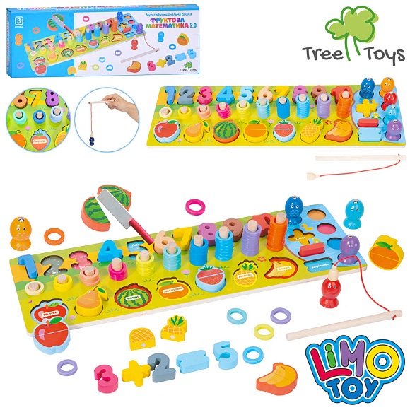 Опис Дерев'яна іграшка Багатофункціональна дошка md 0854 цифри,кільця,фрукти(пазли,магніт.),риболовля,кор
