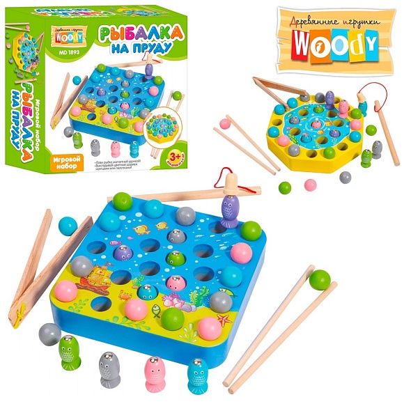 Опис Дерев'яна іграшка Риболовля MD 1893 магнітна, рибки, вудочка, пінцет, палички, кульки, кор.