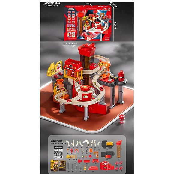 Опис Трек JP588-11 пожежна, ліфт, рух. деталі, машинки 8 шт., муз., світло, бат., кор., 57,5-41,5-14,5см.