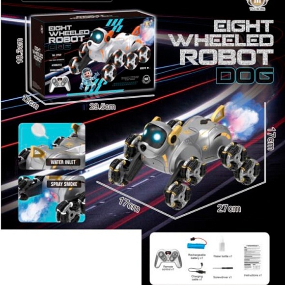 Опис Тварина 7726 радіокер., акум, 26см,собака,колеса-ролики,трюкова, муз.,світло, пара/дим,USBзар.в кор.