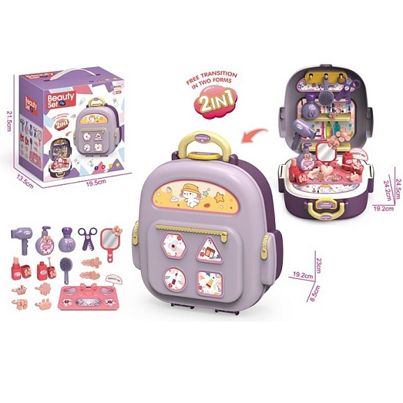 Опис Набір аксесуарів 2501-3 2в1 (валіза, трюмо), фен, гребінець, флакони, каблучки, кор., 21,5-19-13 см.