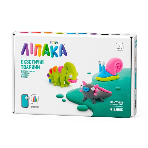 Опис Набір пластиліну, що самостійно твердіє, ЛІПАКА - ЕКЗОТИЧНІ ТВАРИНИ: ХАМЕЛЕОН, ГАСТРОПОДА, АКСОЛОТЛЬ