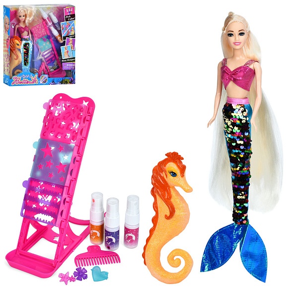 Опис Лялька 68372 30см,русалка,довге волосся,хвіст-паєтки,морський коник 20см,фарба для волосся,трафарет