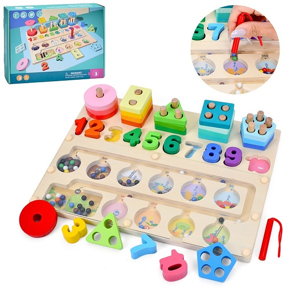 Опис Дерев'яна іграшка Багатофункціональна дошка md 0874 геометрика,цифри,лабіринт,слова(англ.),кор.,32,5