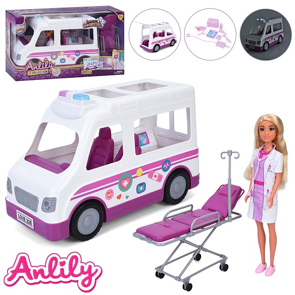 Опис Лялька 636119 лікарка,машина/швидка допомога(муз, світло),каталка медична, мед.інст.,кор.,48-26