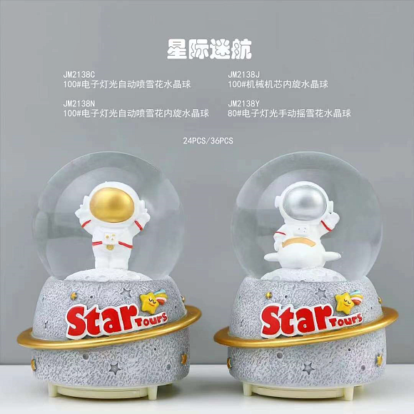 Декоративна куля JM21C38 сніжна куля, космонавт, 2 види, муз., світло, бат., кор., 14-19-14 см.