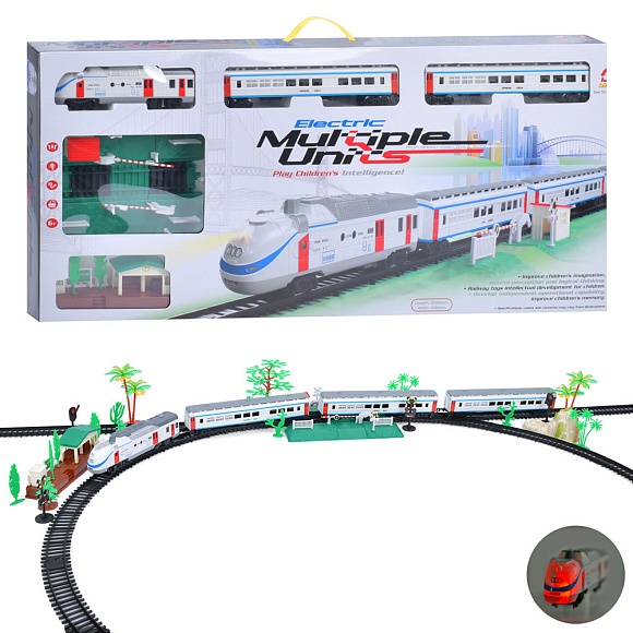 Залізниця 22840 локомотив, 3 вагони, шлагбаум, вокзал, муз., світло, бат., кор., 89,5-38,5-8 см.