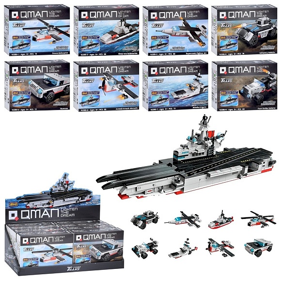 Конструктор Qman 42205 транспорт,від 66 дет.,кор.,8в1(авіаносець),8шт.(8 видів)в диспл.,38-14-19,5см