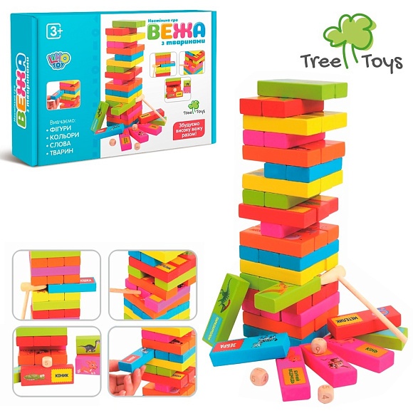 Опис Дерев'яна іграшка Гра MD 2336 Вежа, навч. (тварини), молоточок, кор., 24,5-18-5 см.