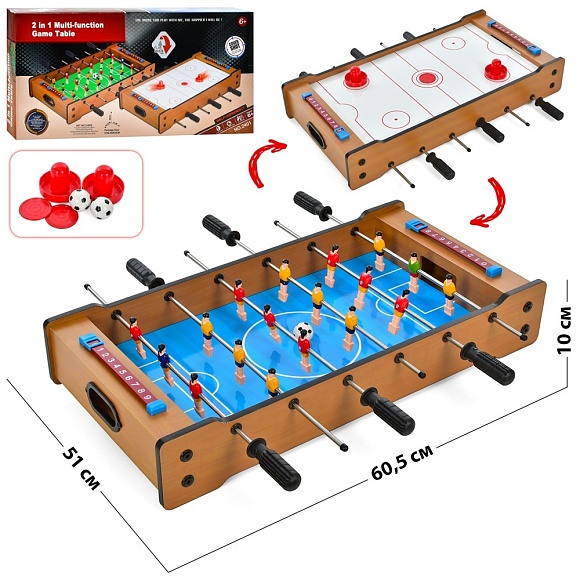 Опис Настільна гра 2401 дерев., 2в1(футбол, хокей), 60,5-51-10 см., шкала вед.рахунку, кор., 61-30-6,5см.