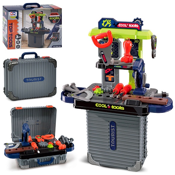 Опис Стіл з інструментами 008-302A молоток, пила, гайк.ключ, викрутки, чемодан/карт.обг., 23,5-19,5-9 см.