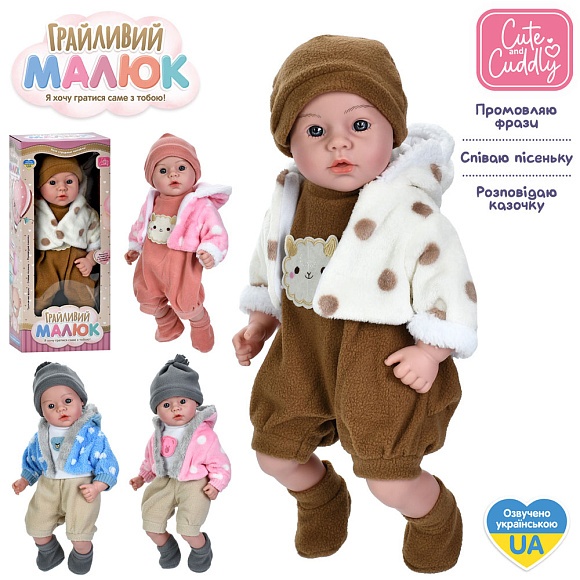 Опис Лялька gd 0001 i ua Грайливий малюк, пупс, м'яконабивний, муз.(укр), 4 види, бат., кор.,19-45-12 см.
