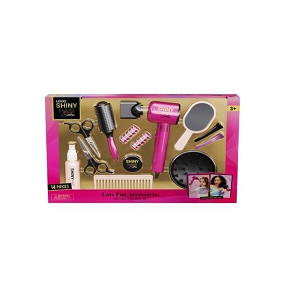 Опис Набір аксесуарів 626021 набір перукаря,фен-повітря,гребінець,ножиці,флакон,шпильки,дзеркало,бігуді,