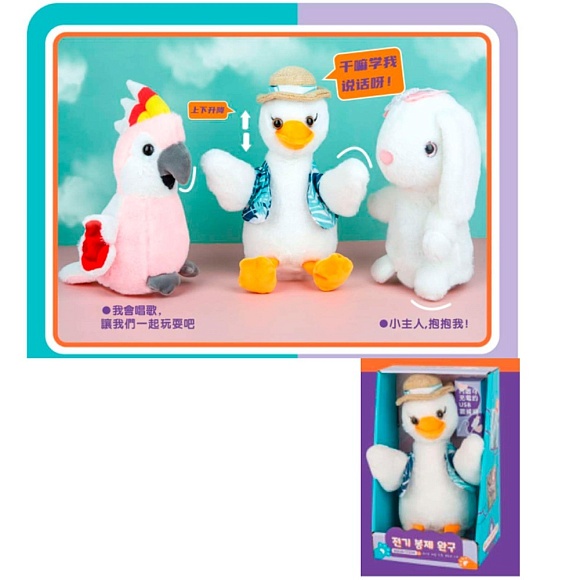 Опис Тварина 777-1 повтор, рухливий, плюш, 3 види(зайчик, гусак, папуга),світло,бат.,кор.,17-27,5-13,5см.