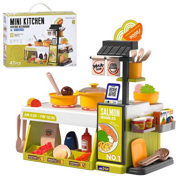 Опис Магазин 889-292 морепродукти, прилавок, плита, посуд, продукти,гроші,муз.,світло,бат.,кор.,34-26-8см