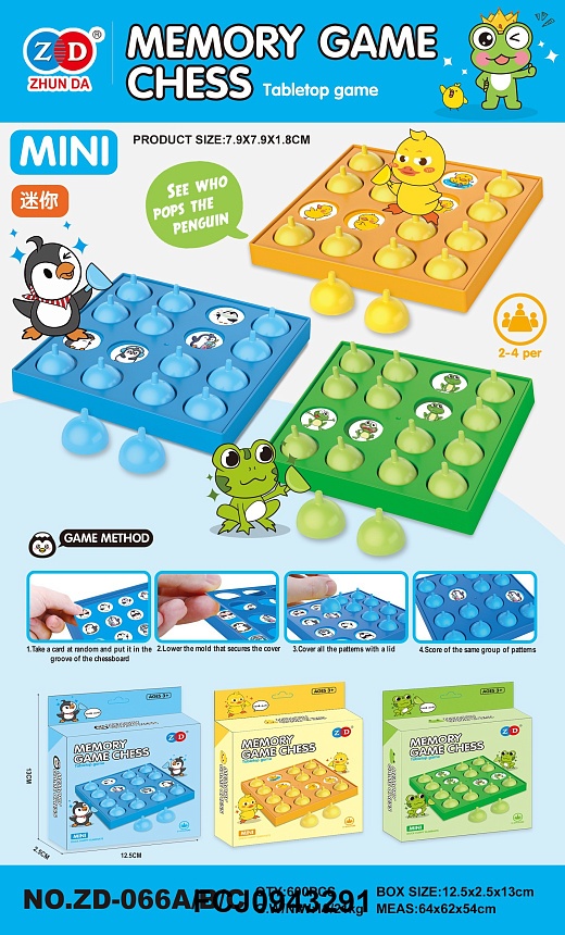 Опис Настільна гра ZD-066ABC Тренуй пам'ять, ігрове поле, фішки, наліпки, 3 види, кор., 12,5-13-2,5 см.