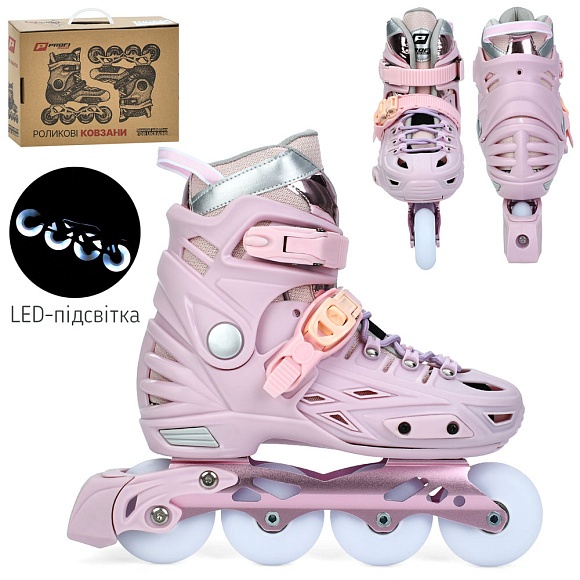 Опис Ролики A4155-L-P розсув.,шнурів.+бакля,алюм.рама,кол.ПУ70мм,LEDсвітло,устілка 24см,рожев.,кор.,42-35