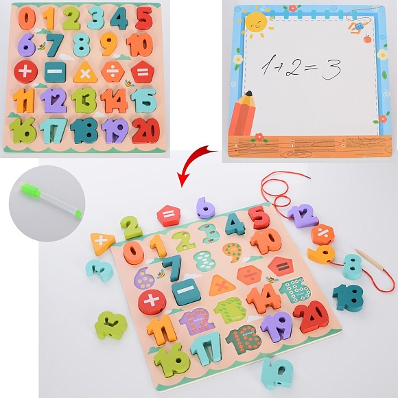 Опис Дерев'яна іграшка Рамка-вкладиш md 1844 3в1 (дощечка/шнур), цифри, мат. знаки, кул., 30-30-2 см.