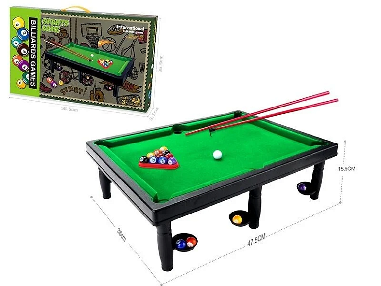 Якщо ви любите більярд, то знаєте, що практика є ключем до вправності у грі. Але не у всіх вдома є місце для цілого столу для більярду і тут у нагоді стає ця зменшена версія цієї гри.Цей компактний столик для більярду стане чудовим додатком до сімейної колекції настільних ігор і прекрасною нагодою для нових спогадів про гарно проведений час із сім’єю. У наборі зі столиком йдуть два киї та шари, а розбірні ніжки столика роблять його компактним та портативним.