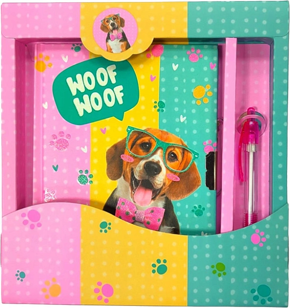 Опис Блокнот дитячий на замочку в подар.коробочці з ручкою 195x210х20mm, 70g, 56 л, Песик в окулярах і метеликом