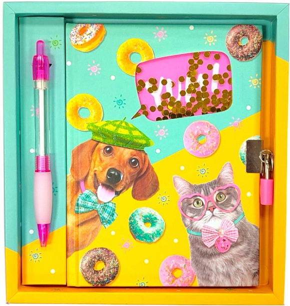 Блокнот дитячий на замочку з ручкою 190 x 200 x 25 mm, 70g, 56 л, Пес, кіт і пончики
