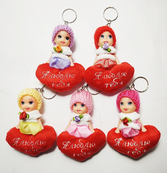 Брелок ляльки зроблені з пластмаси у вигляді ляльки пупса з ручками і ніжками. Лялька одягнена в платтячко, а замість ніг до ляльку прикріплено м'яке серце. На шиї ляльки закріплений пухнастий шарф в центрі якого знаходиться квітка. На голові ляльки закріплено в'язану шапку. Висота ляльки становить 10 см, а довжина брелка 12 см, а ширина брелка 40 мм.