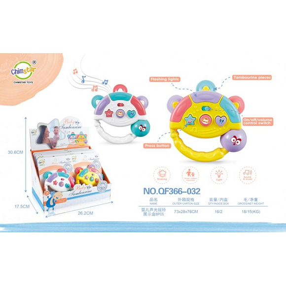 Опис Брязкальце QF366-032 муз., світло, бат., 8шт. (2кольори) в диспл., 27-18-18см.