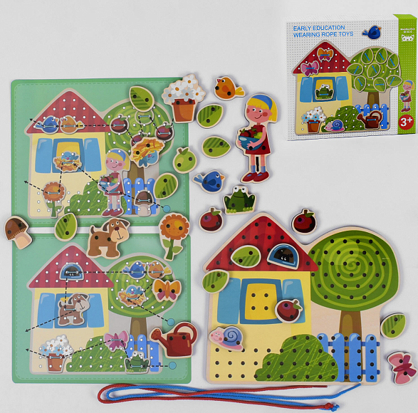 Дерев'яна гра шнурівка К 17549 - це захоплива і дуже цікава гра, яка дозволить малюкам проявити творчі здібності та розвине дрібну моторику рук.У комплект входить дощечка із зображенням будиночка, дерева, куща та паркана. На дощечці, за допомогою додаткових елементів дитина буде створювати власну картинку і сюжетні до неї історії.