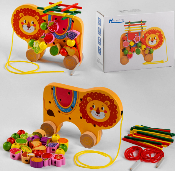 Також каталочка поєднує у собі захоплюючу гру шнурівку з фруктами, овочами та строкатими намистинами. У набір входить шнурок з дерев'яним наконечником, який допоможе малюкові закріплювати намистини на спинку левеня.