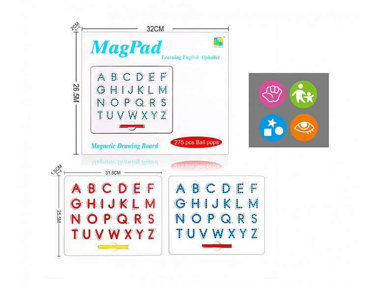 Магнітна дошка: англ.алфавіт, в коробці. Матеріал - пластмаса. Використовуючи магнітну ручку, проводимо за стрілками, що вказані на дошці та тренуємо руку до письма. Для дітей від 3 років. Розмір коробки: 32Х26.5Х2 см