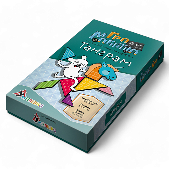 Склад: магнітне поле 20х20см, магнітний танграм 10х10см, схеми 10 цифр і 50 тварин.