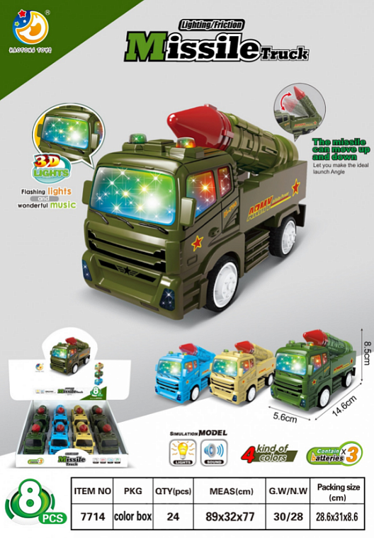 Опис Іграшка №7714 "Ракетна вантажівка" музична світиться (5.6 * 14,6 * 8.5) см уп. 8 шт 4 кол