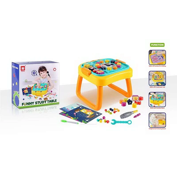 Опис Ігровий столик 835 (18) мозаїка, дошка пиши-витирай, болтики, викрутка, геометричний сортер, пазл, годинник, цифри й математичні знаки, в коробці