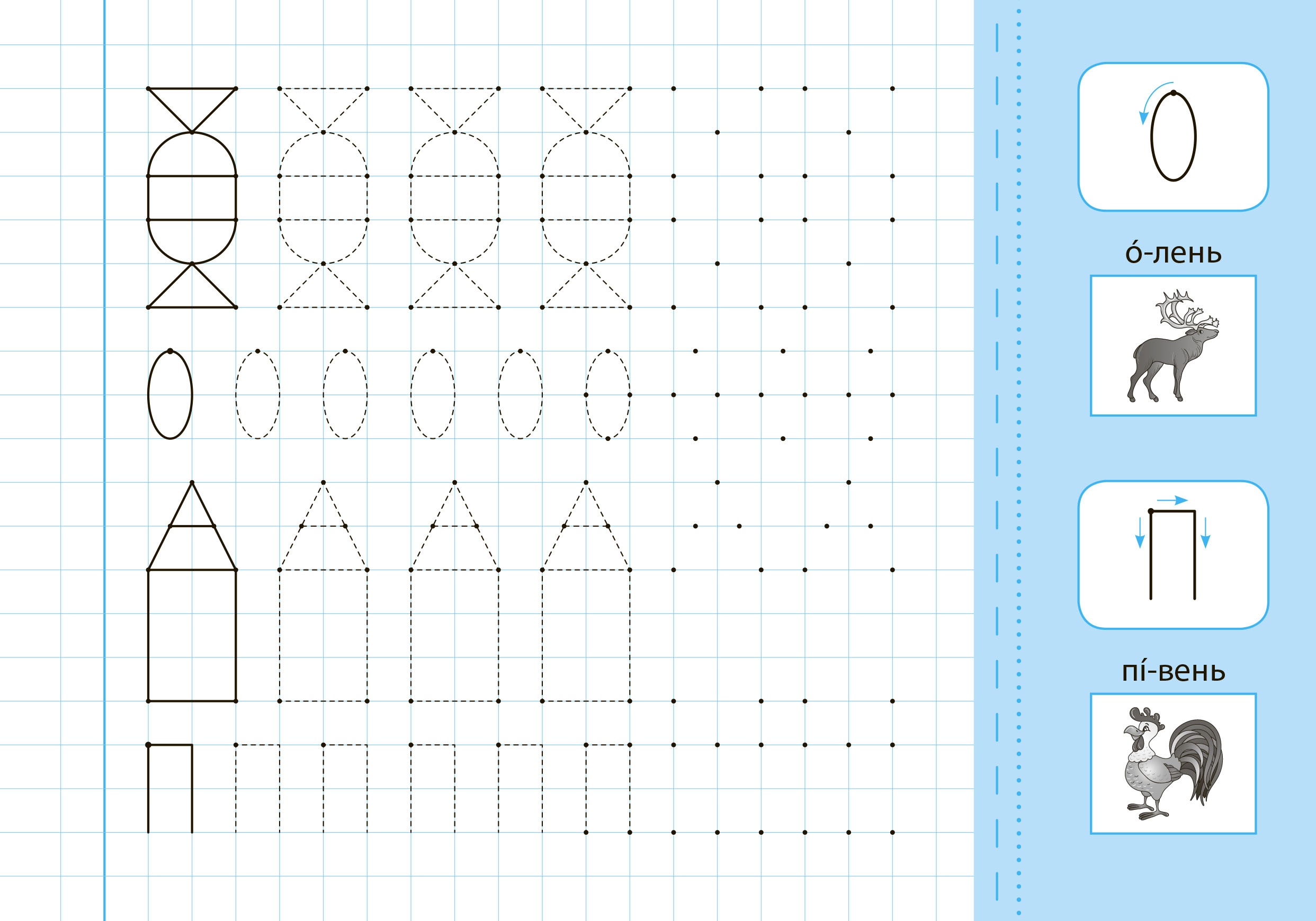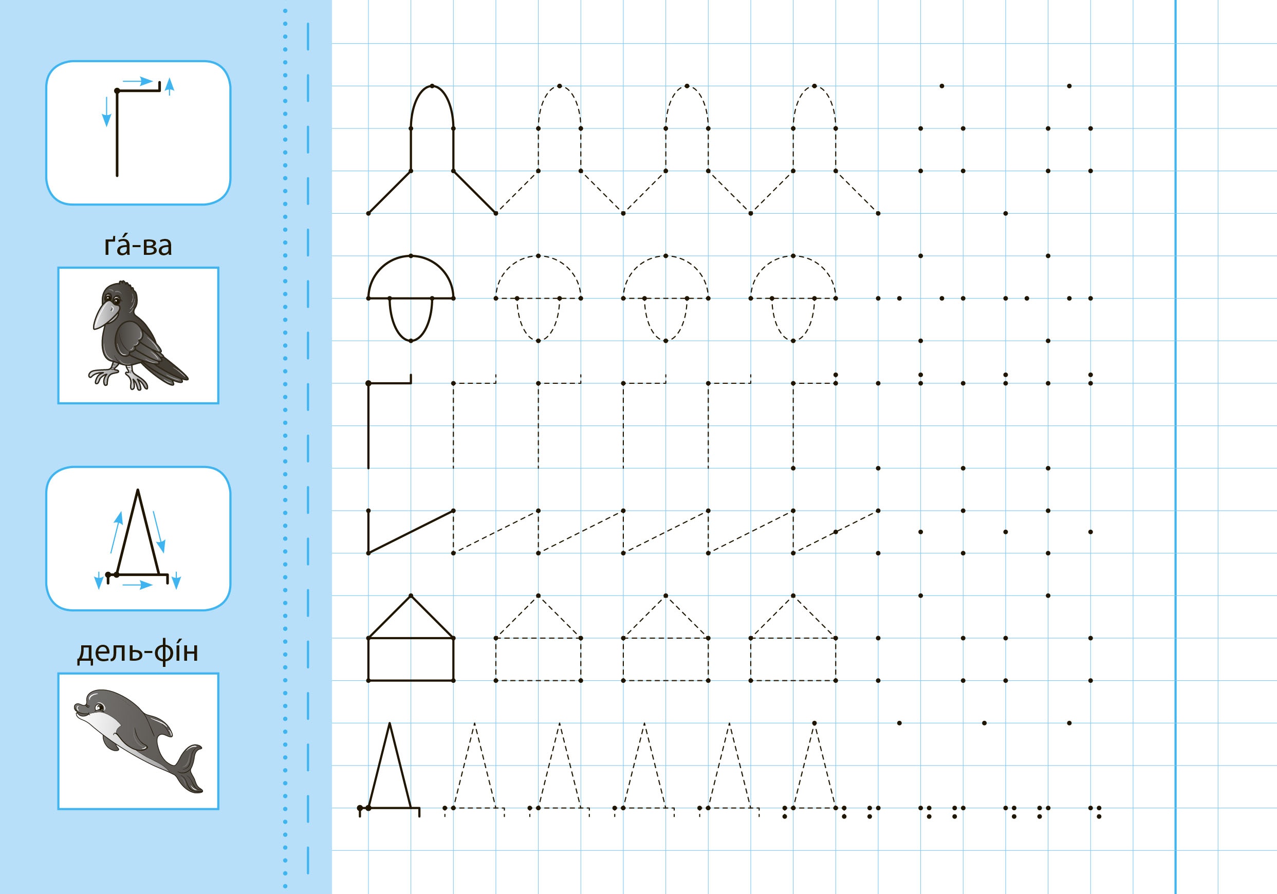 Із цією книжкою малюк швидко підготує руку до письма, малюючи різноманітні предмети по клітинках і точках, навчиться писати друковані літери, збільшить свій словниковий запас. Систематичні заняття сприятимуть розвитку дрібної моторики, уваги та пам’яті, а кольорові наліпки урізноманітнять процес навчання й зроблять його ефективним і цікавим.